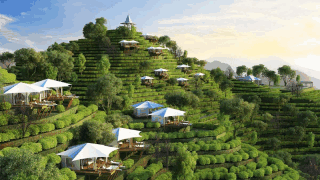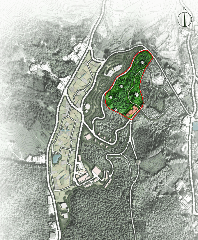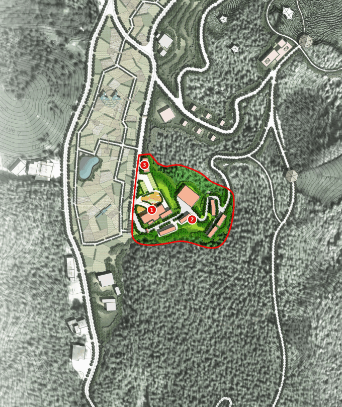 设计构思:缤纷茶坪板块依托优质的茶园景观延伸产业链,诠释鸡文化内涵,突出半山观景、远眺林海、登高健身等特色,建设鸡鸣主题茶吧、观景餐厅、观景健身平台、帐篷露营等项 目,打造高端野奢度假体验。在板块制高点,依托现有存量建设用地,打造可俯瞰园区和周边的的精神建筑地标。